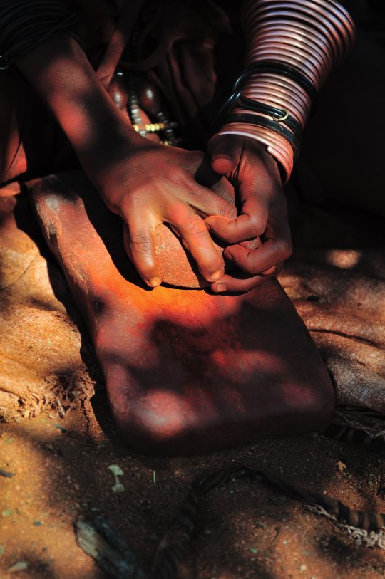 The Science: Iron oxides slow down collagen-degrading enzymes, preserving hides while adding a permanent red hue. Mixed with fats, letsoku also improves flexibility and water resistance.