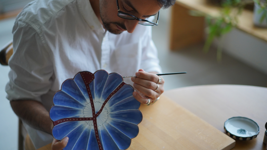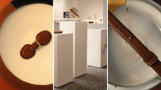 Leather became both a structural solution and an aesthetic choice, “a bridge between my work and Japanese craft traditions.” The project has since evolved into a collaboration with Japanese pottery artisans, “taking their broken pieces and building this project as a storytelling experience.”