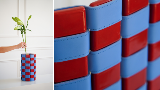 The CADABRA vase – a striking fusion of custom ceramic tiles woven into premium hand-stitched leather straps – came about almost by chance. “It began with leftover ceramic tiles from another project and leather straps that were originally meant for belts,” Roee recalls. “My first idea was simply to weave them into a wall piece.”